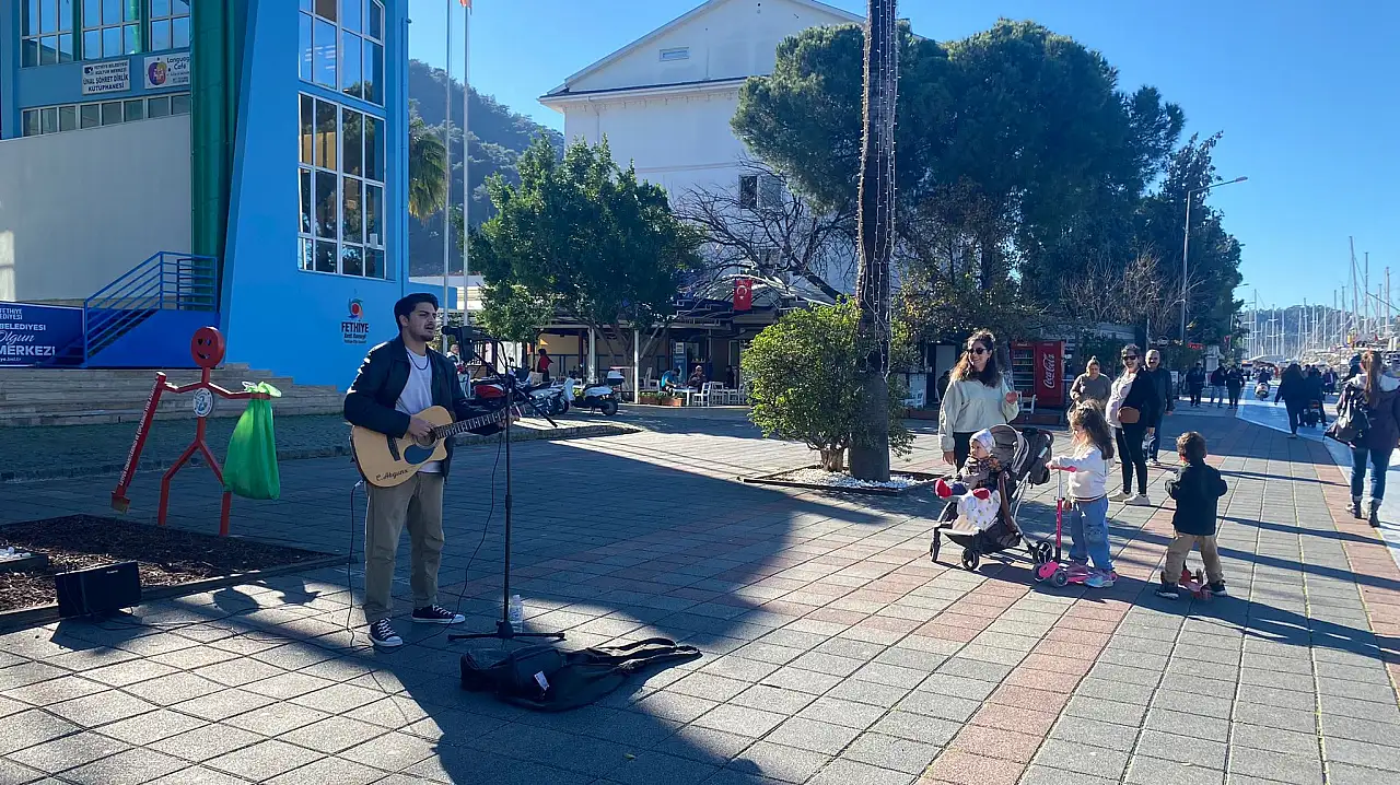 İstanbullu sokak müzisyeni Çağatay Fazıl Akgün, sağanak yağışların ardından yüzünü gösteren güneşi fırsat bilerek Fethiye sokaklarında müziğini icra etti. Akgün, Fethiyelilerin sokak müziğine büyük ölçüde olumlu yaklaştığını söyledi.