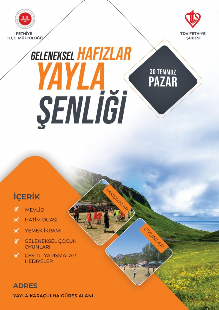 Dört yıldır Fethiye müftülüğüne bağlı Kur'an kurslarında okuyan öğrenciler için motivasyon şenliği olarak düzenlenen “Hafızlar Yayla Şenliği” bu yıl 30 Temmuz 2023 Pazar günü Yayla Karaçulha Güreş Alanında yapılacak.
