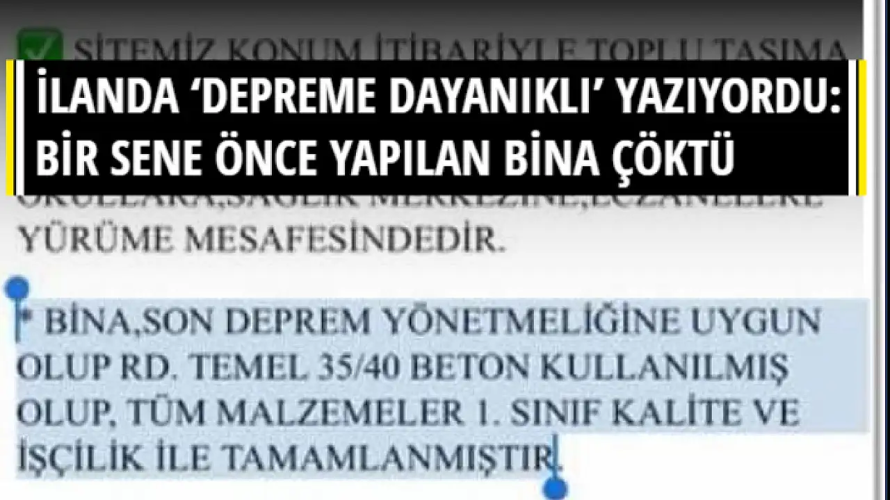 İLANDA 'DEPREME DAYANIKLI' YAZIYORDU: BİR SENE ÖNCE YAPILAN BİNA ÇÖKTÜ