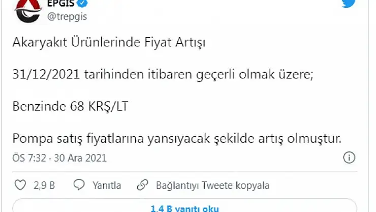 31 Aralık 2021 tarihinden itibaren geçerli olmak üzere; benzinde 68 KRŞ/LT pompa satış fiyatlarına yansıyacak şekilde artış oldu.