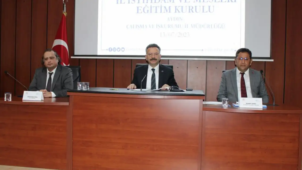 Aydın İl İstihdam Kurulu Mesleki Eğitim Kurulu Toplantısı, Aydın Valisi Hüseyin Aksoy başkanlığında gerçekleştirildi. Aydın’ın, işgücü istihdam ve mesleki eğitim ihtiyacını tespit etmek, mesleki ve teknik eğitim okul ve kurumları ile işletmelerde yapılacak mesleki eğitim ve istihdam konularında etkinlik ve verimliliği artırmak amacıyla düzenlenen Aydın İl İstihdam Kurulu Mesleki Eğitim Kurulu 2023 yılı 3. Olağan Toplantısı’nda Aydın genelindeki işgücü sayısı açıklandı.