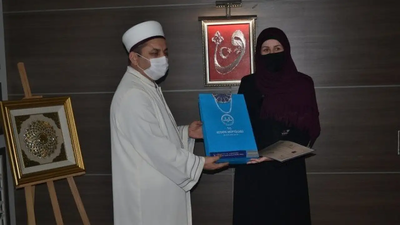 Fethiye İlçe Müftüsü Kamil Oktay da ihtida belgesini takdim ettiği Charlotte Marie Atkinson'a, Kuran-ı Kerim’in İngilizce mealini ve dini kitaplar hediye etti.
