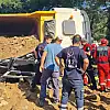 İş makinesi ve küreklerle kamyon içerisindeki toprak boşaltılmaya çalışıldı. Zamana karşı yarışın yapıldığı kaza yerine vinç geldi. Zincirlerle vince bağlanan kamyon, alttan da iş makinesinin desteğiyle kaldırıldı.