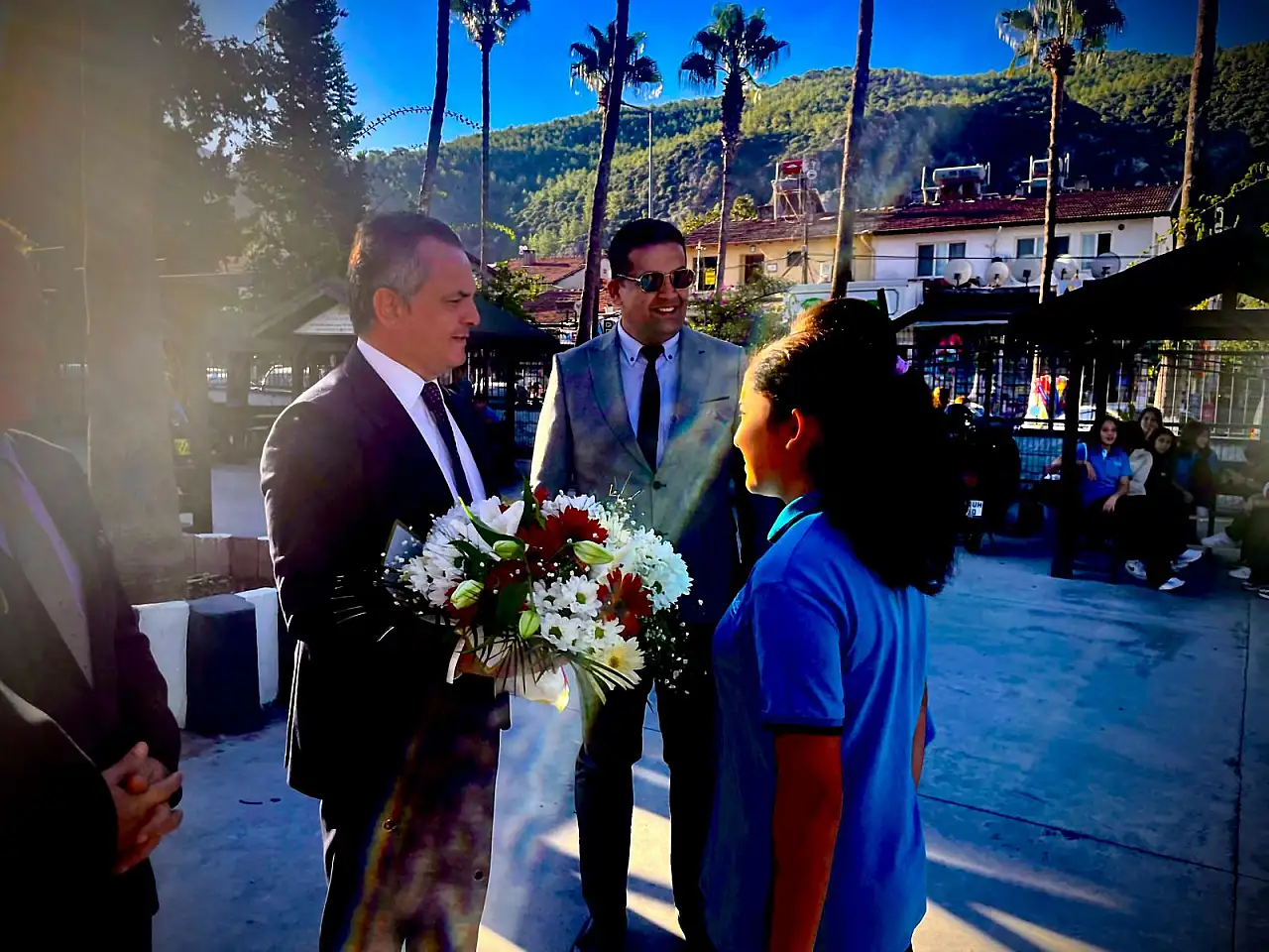 Muğla'nın Fethiye ilçesinde yeni eğitim-öğretim yılı kapsamında düzenlenen bayrak törenine Kaymakam Fatih Akkaya ve İlçe Milli Eğitim Müdürü Faruk Kaya katıldı. Törende öğretmen ve öğrencilerle bir araya gelindi.