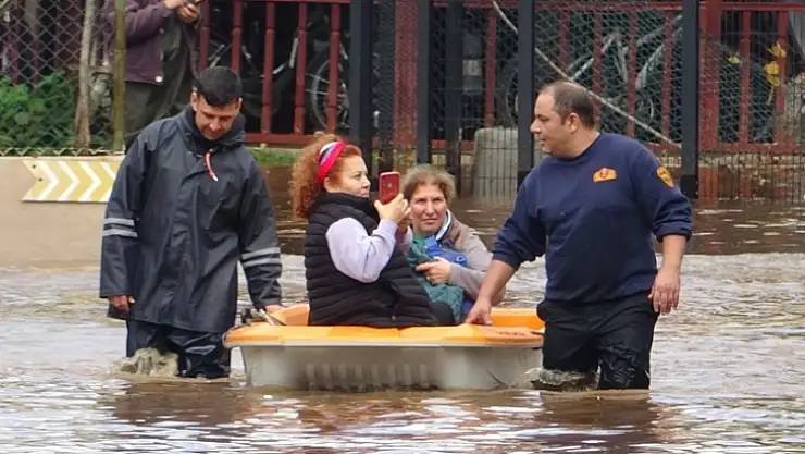 Fethiye'de yağmur nedeniyle su basan evlerde mahsur kalanlar, itfaiye botu ve iş makineleriyle kurtarıldı.