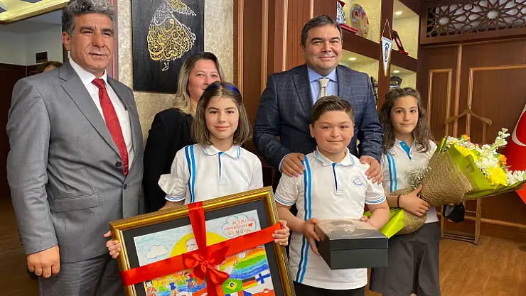 Öğrenciler Fethiye Kaymakamı Alper Balcı’ya Türk Bayrağı ve kendi yaptıkları tabloyu hediye ettiler. Kaymakam Balcı’a çocuklara çeşitli hediyeler verdi.