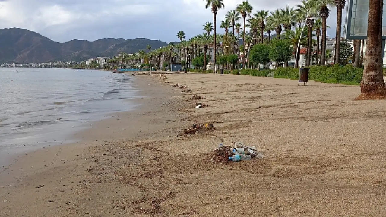 Temizlik işçileri dalgaların etkisiyle kıyıya vuran evsel atıkları ve erişte diye adlandırılan yosunları titizlikle temizledi. Çalışmalar ikinci gün de İçmeler Halk Plajı’nda devam etti. Atıkları toplayan ekipler fırtınanın izlerini sildi.