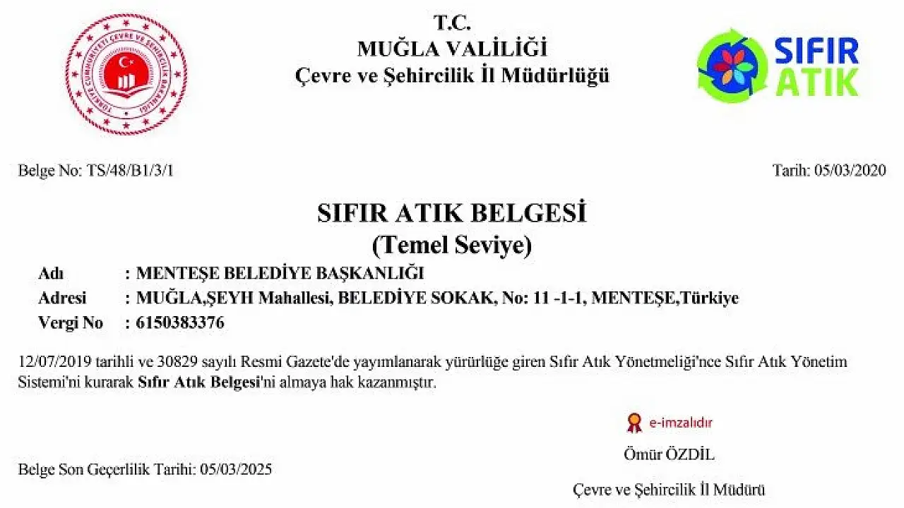 Çevre ve Şehircilik Bakanlığı Entegre Çevre Bilgi Sistemi (EÇBS) üzerinden yaptıkları ‘Temel Seviye Sıfır Atık Belgesi’ başvurusunun Muğla Çevre ve Şehircilik İl Müdürlüğünce incelenerek sistem üzerinden onaylandığını söyledi.