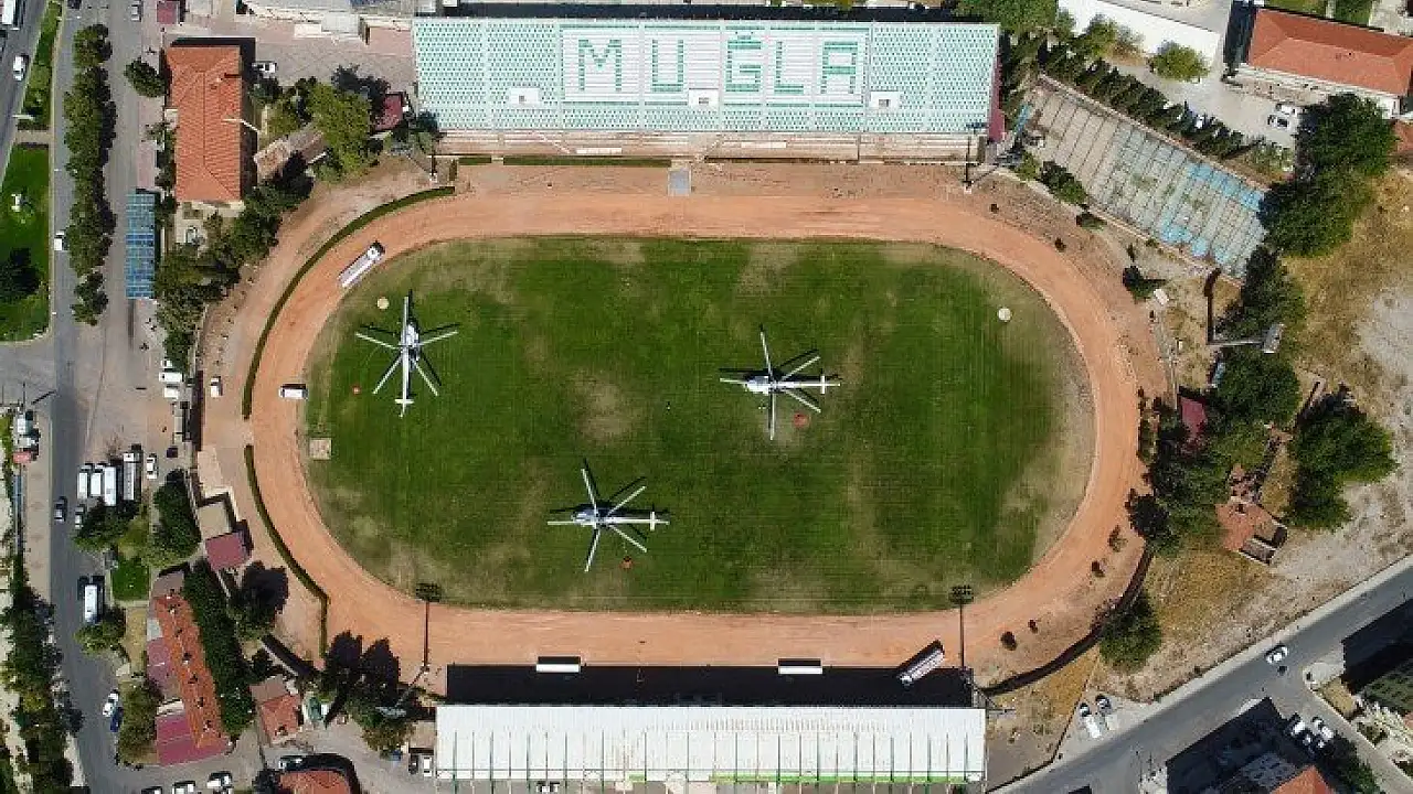 Muğla’daki yangınlara havadan müdahale eden helikopterlerin stadyumdaki ikmal alanı ile helikopter ve personellerin göreve hazırlanışı havadan görüntülendi.