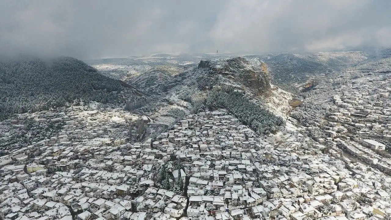 Kentsel sit alanını içinde barındıran Menteşe’nin Karamehmet, Kiramettin, Orta Mahalle, Müştakbey ve Karşıyaka Mahallerindeki tarihi dokular havadan görüntülendi. Geleneksel oluklu tuğladan yapılan çatılar beyaz örtü ile kaplandı.