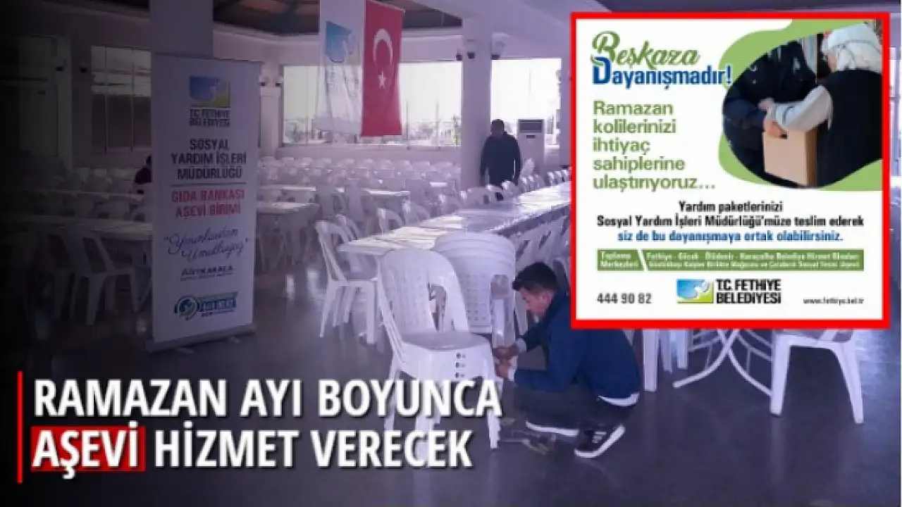 Fethiye Belediyesi, Ramazan ayı boyunca Çatalarık Sosyal Tesislerde bulunan aşevinde iftar yemeği verecek. Mübarek Ramazan ayı dolayısıyla Fethiye Belediyesi ayrıca Ramazan Kolisi dağıtmaya devam ediyor. Fethiye Sosyal Yardım İşleri Müdürü Ali Rıza Kıroğlu, 'Bizler yardım kolilerimizi ulaştırıyoruz. Ancak Ramazan sofrasında benim de katkım olsun diyen hayırsever vatandaşlarımız varsa, desteklerini bize ulaştırabilir. Biz de ramazan kolilerini yardıma muhtaç vatandaşlarımıza aktarmaya devam ederiz' dedi.