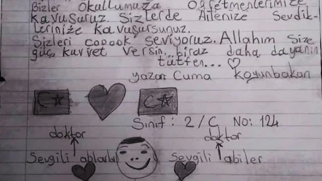 Mart ayından bu yana Korona virüs salgınının baş kahramanları sağlık çalışanlarına yönelik çok sayıda övgü dolu sözler gündeme gelirken, Marmaris’ten 9 yaşındaki Cuma Koyunbakan’ın Muğla Eğitim ve Araştırma Hastanesi’ne gönderdiği mektup duygulandırdı.