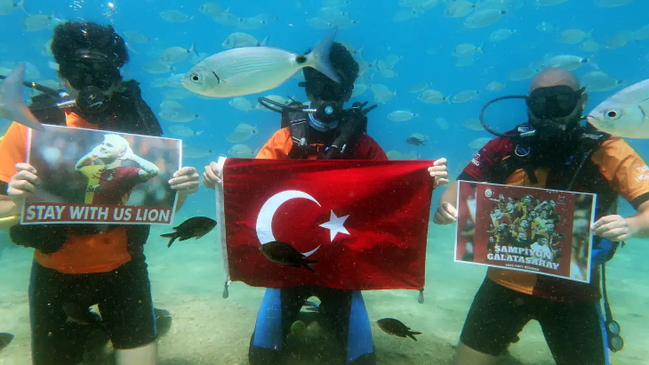 Fethiye Galatasaray Taraftarlar Derneği üyeleri, Süper Lig şampiyonluğunu denizin altında kutladı. Dalış teknesiyle Dalyan Koyu'na açılan grup, Galatasaray formalarıyla deniz dibine dalarak, Türk Bayrağı ve "Biz Galatasaray Cumhuriyeti değil, Cumhuriyet'in Galatasaraylı çocuklarıyız" yazılı pankart açtı. Şampiyonluk kutlamalarının denizde ya da karada fark etmediği söyleyen taraftarlar, farklı bir anı yaşadıkları için mutlu olduklarını ifade etti.