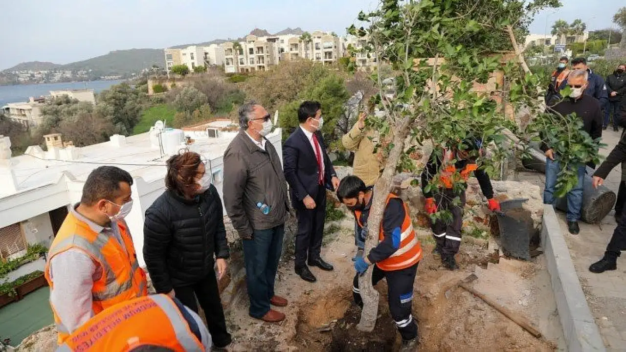 Basın açıklamasının ardından Bodrum Belediyesi Park ve Bahçeler Müdürlüğü ekipleri ile birlikte Başkan Aras ve beraberindekiler kesilen ağaçların yerine begonvilleri ve Benjamin ağaçlarını toprakla buluşturdu.