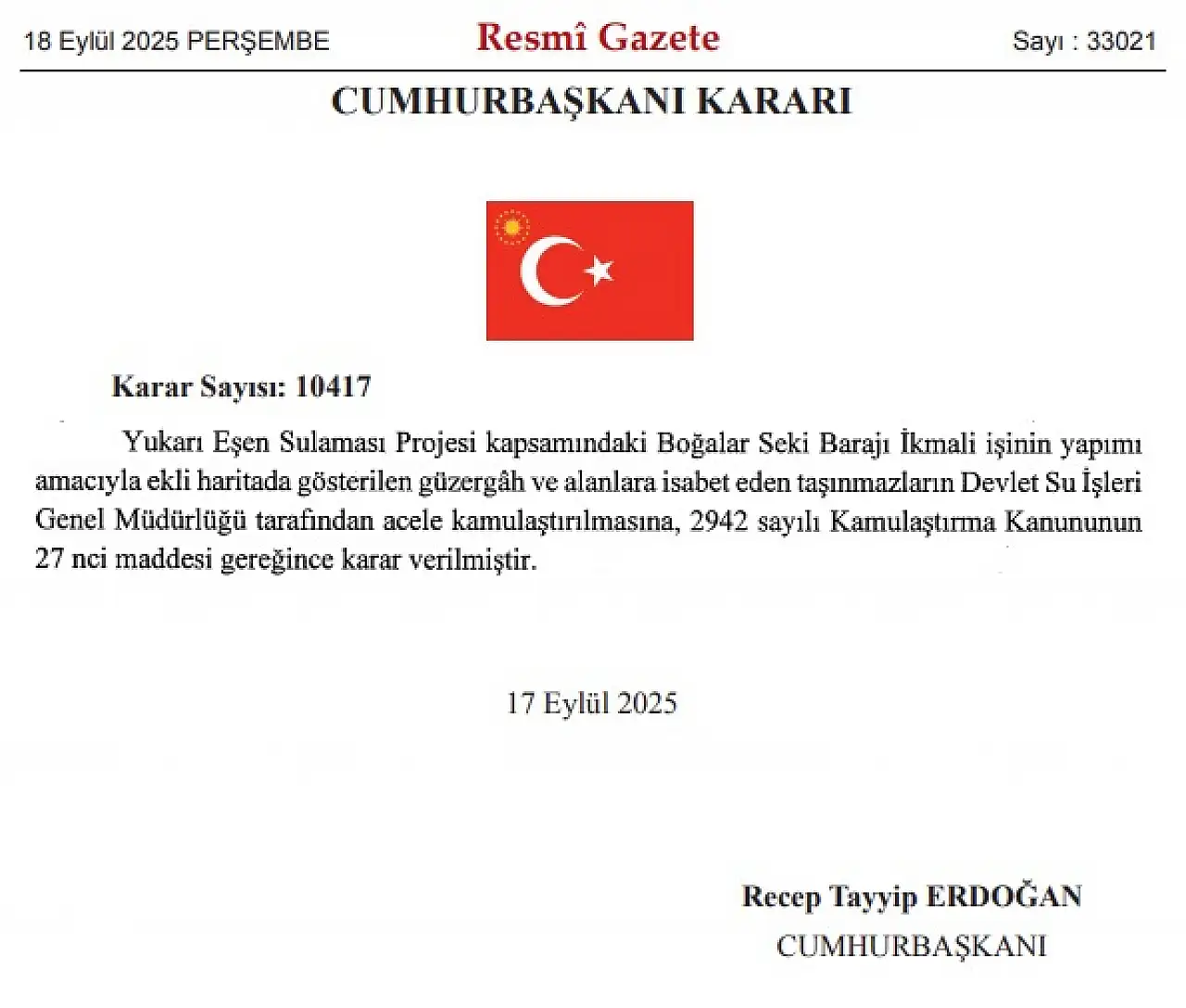 Muğla’da yürütülen Yukarı Eşen Sulama Projesi kapsamında, Boğalar Seki Barajı İkmali için bazı taşınmazların acele kamulaştırılmasına karar verildi. Cumhurbaşkanı kararı, 18 Eylül 2025 tarihli Resmi Gazete’de yayımlanarak yürürlüğe girdi.