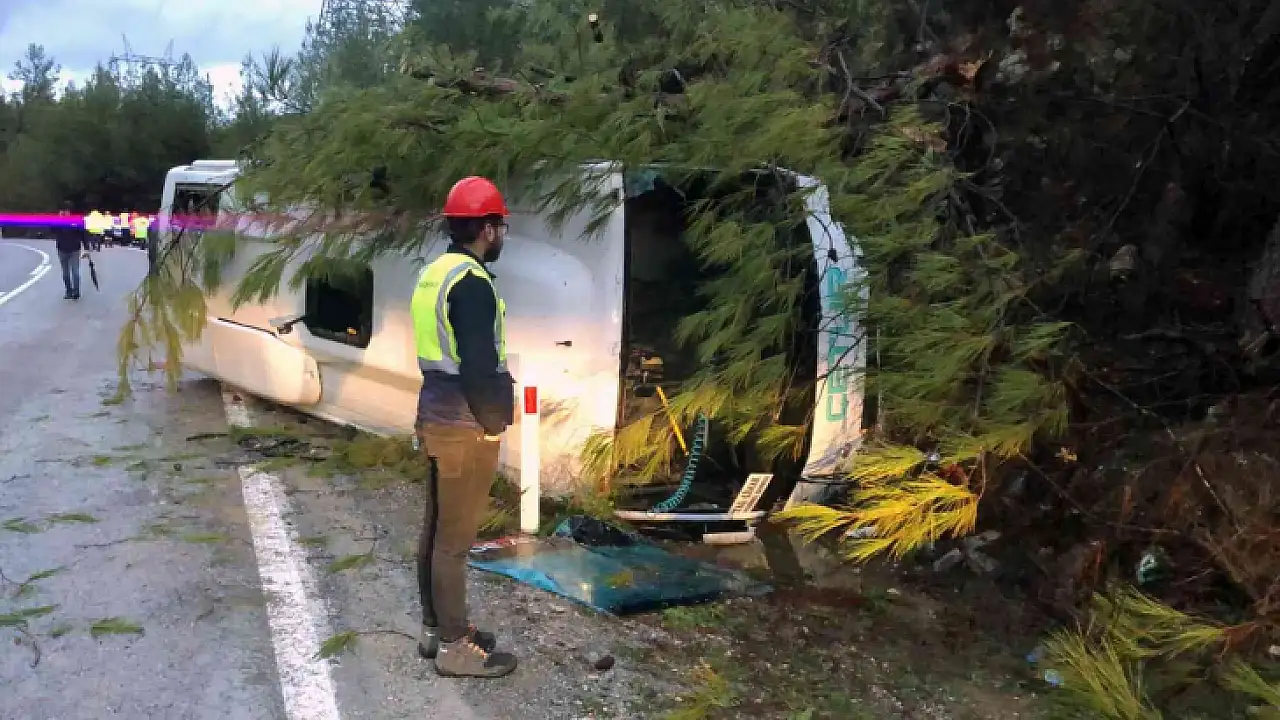 K.D.’nin kontrolünde seyreden 48 S 4003 plakalı servis aracı sürücünün direksiyon hakimiyetini kaybetmesi sonucu kontrolden çıktı. Yan yatan minibüste yolcu olarak bulunan B.U., A.Ç.Y., S.K., N.K., K.D., G.Ç. ve İ.M. yaralandı.
