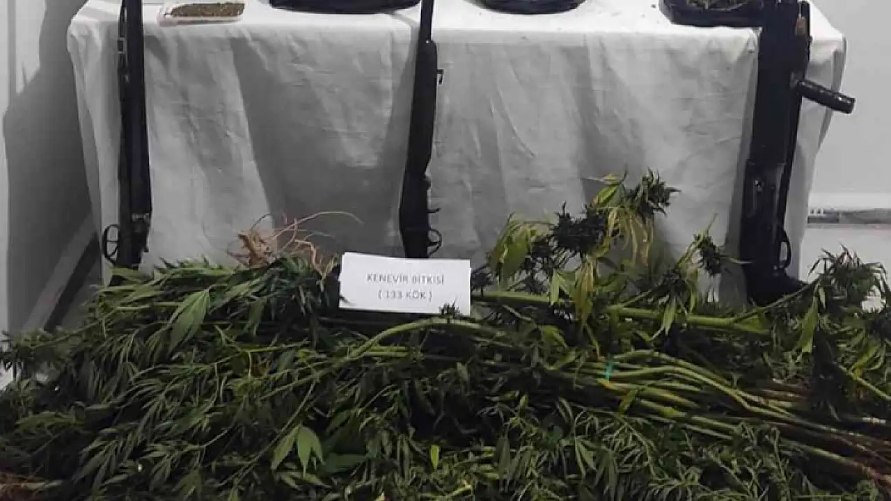Yapılan aramada 133 kök dişi hint keneviri, bir miktar kubar esrar, 3 adet ruhsatsız av tüfeği, bir miktar kenevir tohumu, üzerinde kubar esrar kalıntıları bulunan terazi ele geçirildi.