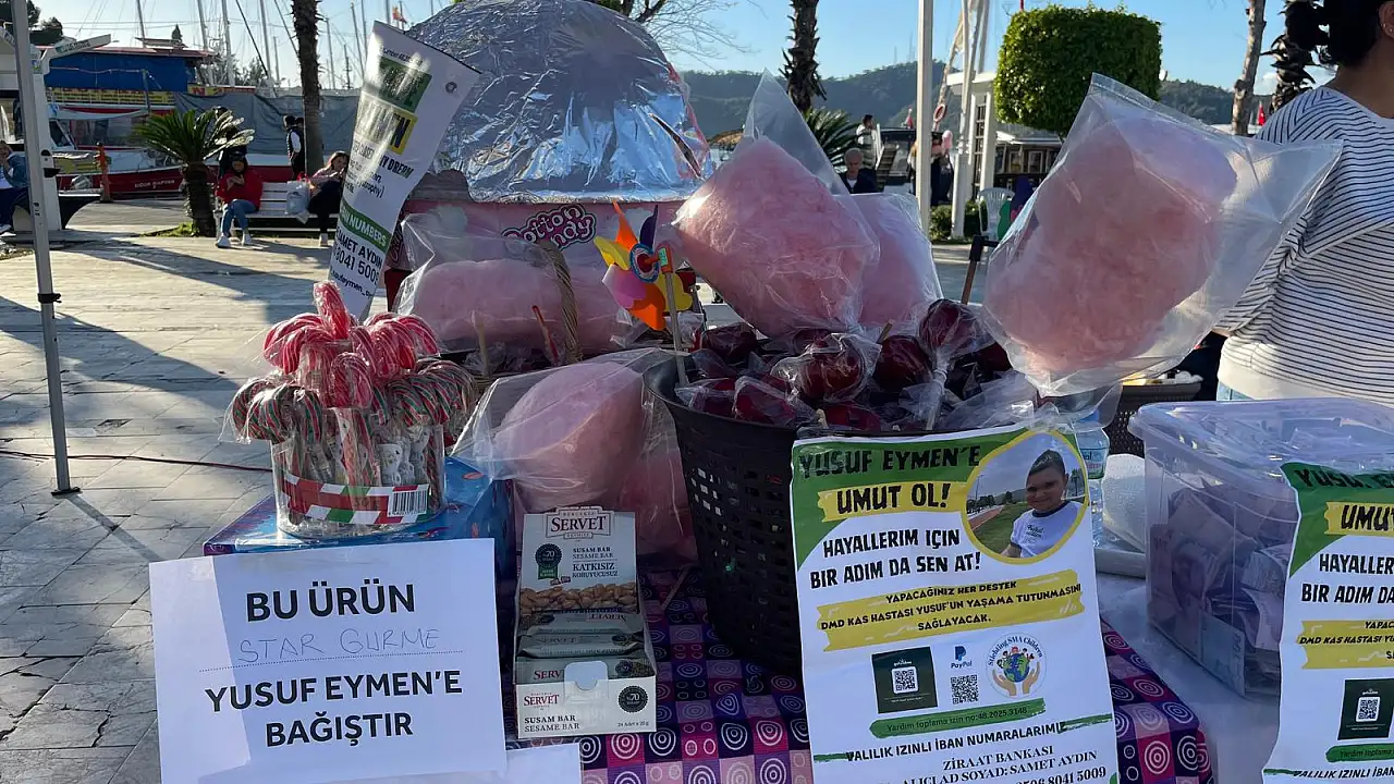 Fethiye Turizm Tanıtım Eğitim Kültür Çevre ve Yardımlaşma Vakfı tarafından Beşkaza Meydanı'nda düzenlenen 'Yusuf Eymen'e Umut Oluyoruz' etkinliğine Seydikemer'den katılan Çiğdem Çetin, yaşanan sel felaketine rağmen hazırladığı elma şekeri ve pamuk şekerleri satarak minik Eymen'e destek verdi.