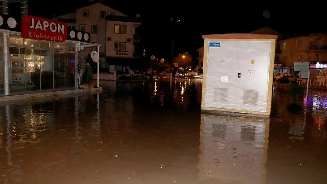 Fethiye'de akşam saatlerinde etkili olan sağanak yağış nedeniyle şehir merkezinde bulunan bazı sokakları su bastı.