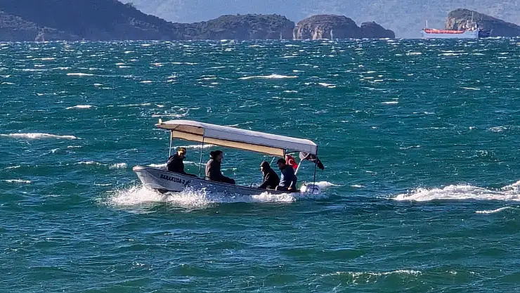 Fethiye'de güneşli havaya rağmen etkili olan soğuk ve sert rüzgar, denizde dalga boyunu yükseltti. Çalış açıklarında 5 kişinin bulunduğu bir tekne, fırtınalı denize rağmen zorlu bir yolculuk yaptı.