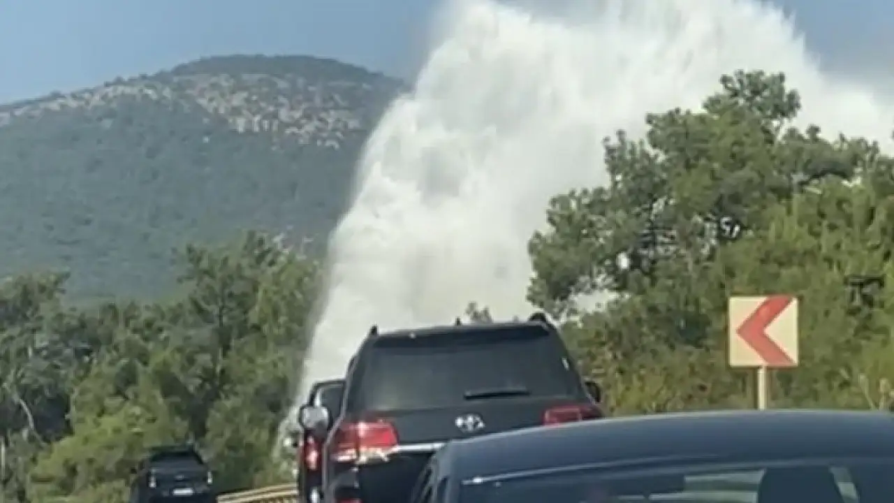 Muğla'nın Bodrum ilçesinde ana isale hattı patladı, tazyikli su metrelerce havaya yükseldi.