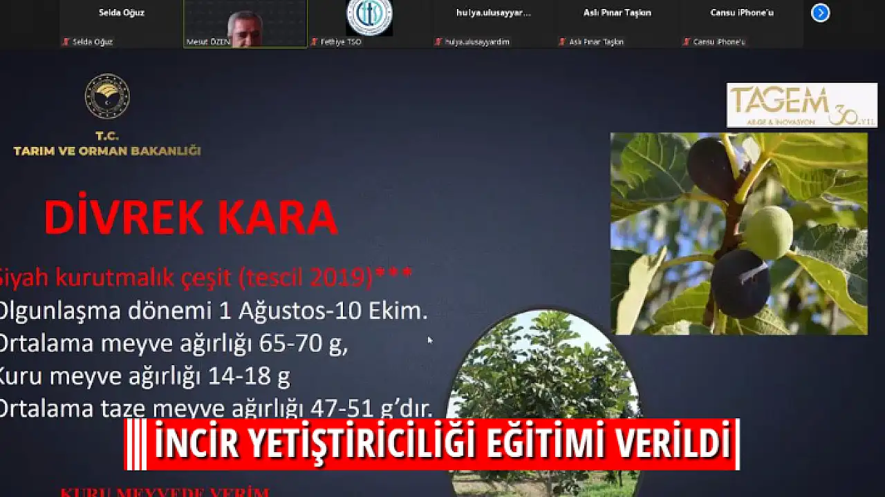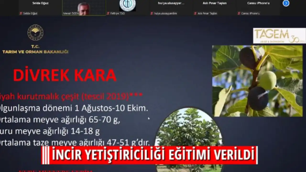 Ziraat Yüksek Mühendisi Eşref Tutmuş ise eğitimde gerçekleştirdiği sunumda incir hastalık ve zararlı çeşitlerini aktarırken biyolojik ve kimyasal mücadele yolları ve uygun mücadele zamanları konusunda bilgi aktardı. Çevrimiçi eğitim, katılımcıların sorularının yanıtlanmasının ardından sona erdi.