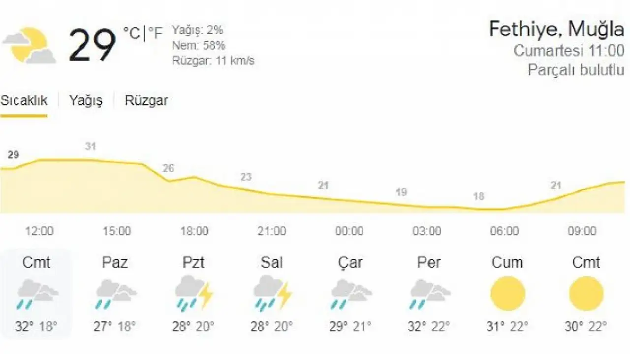 Fethiye’de haziran ayının ikinci haftasına girilmesiyle birlikte hava sıcaklıkları artmaya başladı. 32 dereceye kadar ısınan hava yerli ve yabancı turistleri tatil cenneti Fethiye’ye getirdi. Sıcak havayı değerlendiren tatilciler ve yerli kalk bu durumun tadını çıkartıyor. Bu güzel havaların ardından ise yağışlar kapıya dayandı. Meteorolojiden alınan bilgilere göre Fethiye’de 5 gün boyunca yağış bekleniyor. Pazar günü, öğleden sonra etkili olması beklenen yağışın 16 Haziran Perşembe gününe kadar devam etmesi bekleniyor.