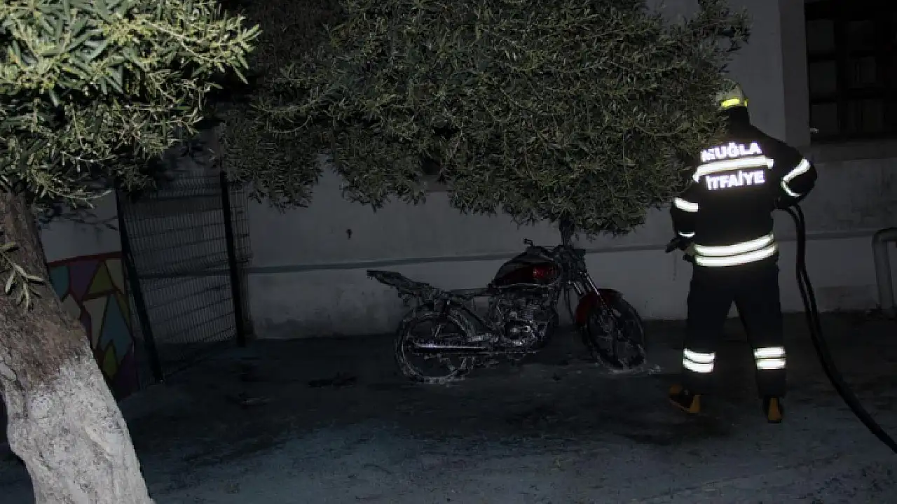 Muğla'nın Menteşe ilçesinde bir okulun bahçesinde bulunan plakasız bir motosiklet henüz tespit edilemeyen bir nedenden yanmaya başladı.