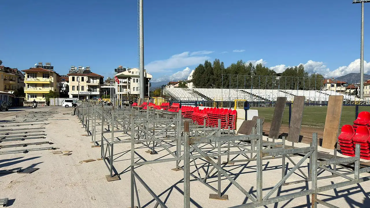 Fethiye Kaymakamı Fatih Akkaya, Ziraat Türkiye Kupası'nda oynanacak Galatasaray–Fethiyespor maçı öncesi Fethiye Şehir Stadı'nda devam eden portatif tribün çalışmalarını yerinde inceledi.