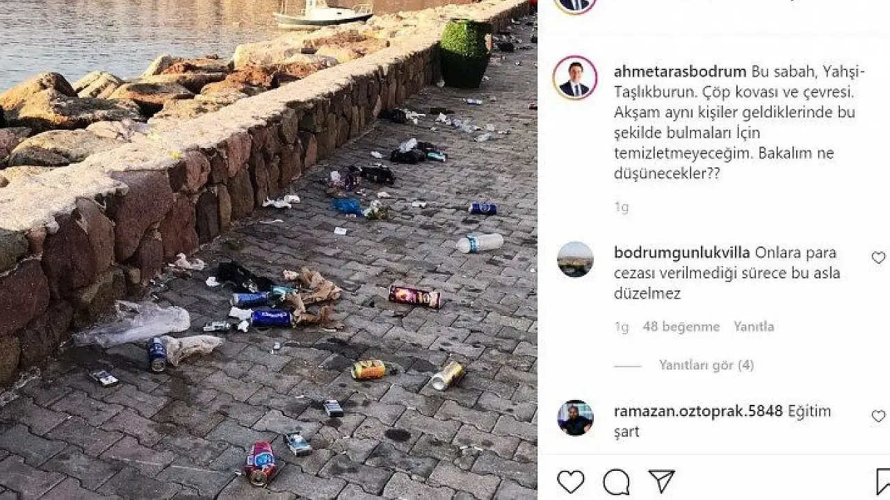 Önceki gün sabah Yahşi sahilinde yürüyüş yapan Bodrum Belediye Başkanı Ahmet Aras, sahilde karşılaştığı manzara karşısında şok oldu. Sahili ve yürüyüş yollarını çöp içerisinde gören ve manzaranın fotoğrafını çekerek sosyal medyadan tepkisini dile getiren Aras, çöpleri temizletmeyeceğini yazdı. Başkan Aras geçtiğimiz aylarda da benzer bir fotoğrafı sosyal medya hesabından paylaşarak vatandaşları çevreye karşı daha duyarlı olmaya davet etmişti.