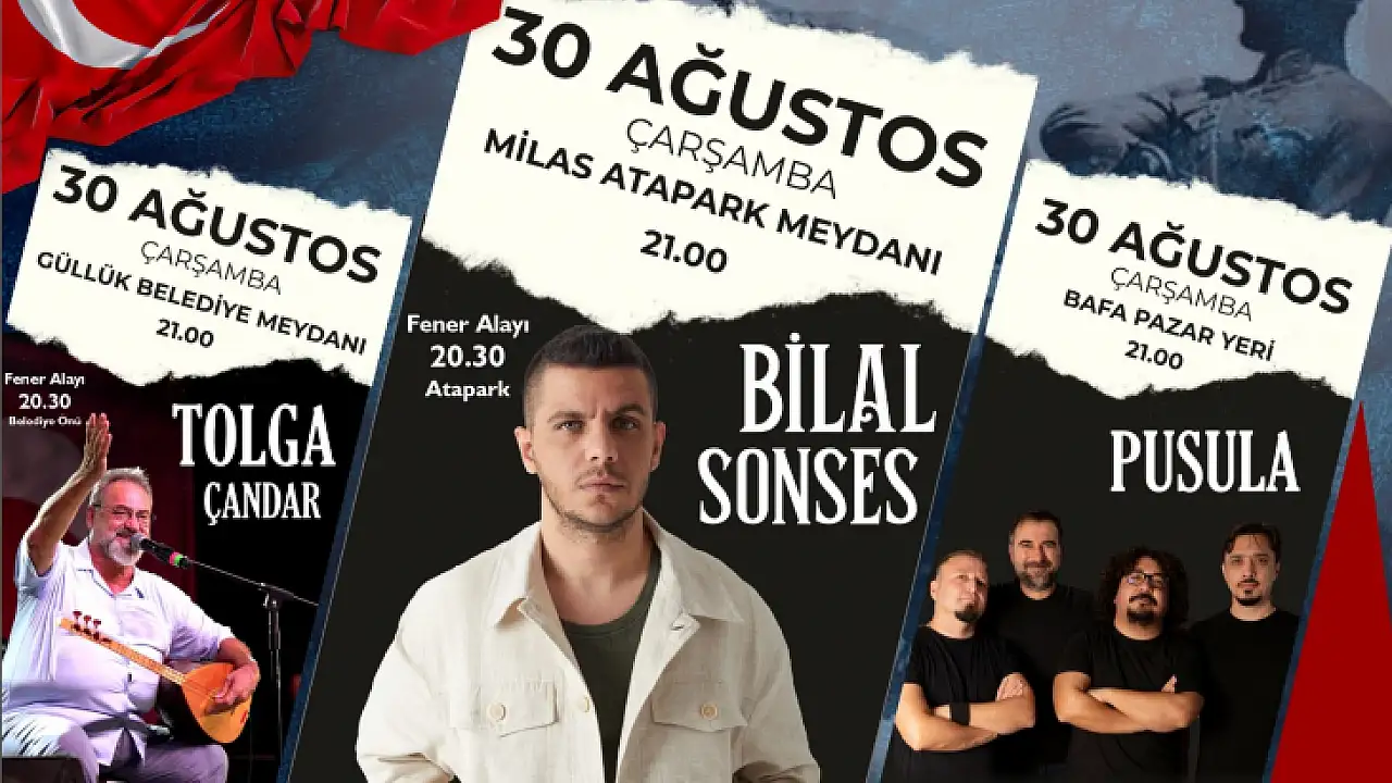 Milas Belediyesi, 30 Ağustos Zafer Bayramı kutlamaları kapsamında Güllük'te Tolga Çandar, Milas Atapark'ta Bilal Sonses, Bafa Pazar Yeri'nde ise Pusula konseri gerçekleştirecek.