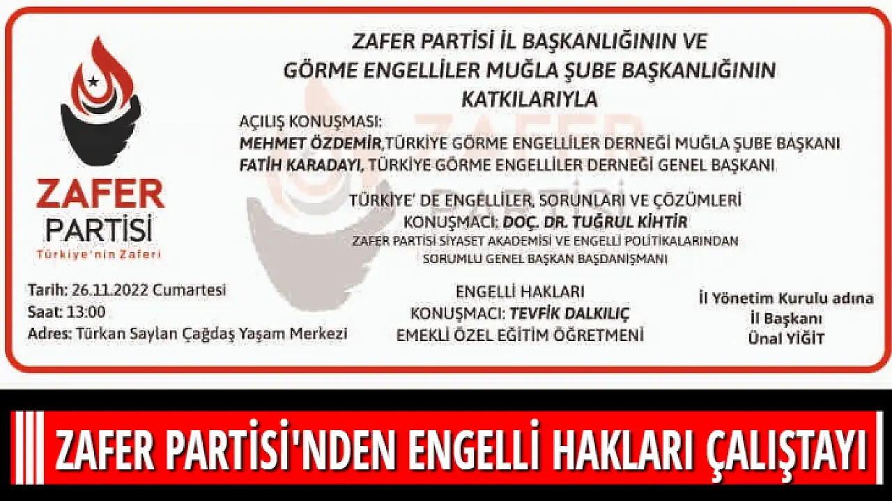 Zafer Partisi Muğla İl Başkanlığı tarafından Engelli Hakları Çalıştay'ı düzenlenecek.
