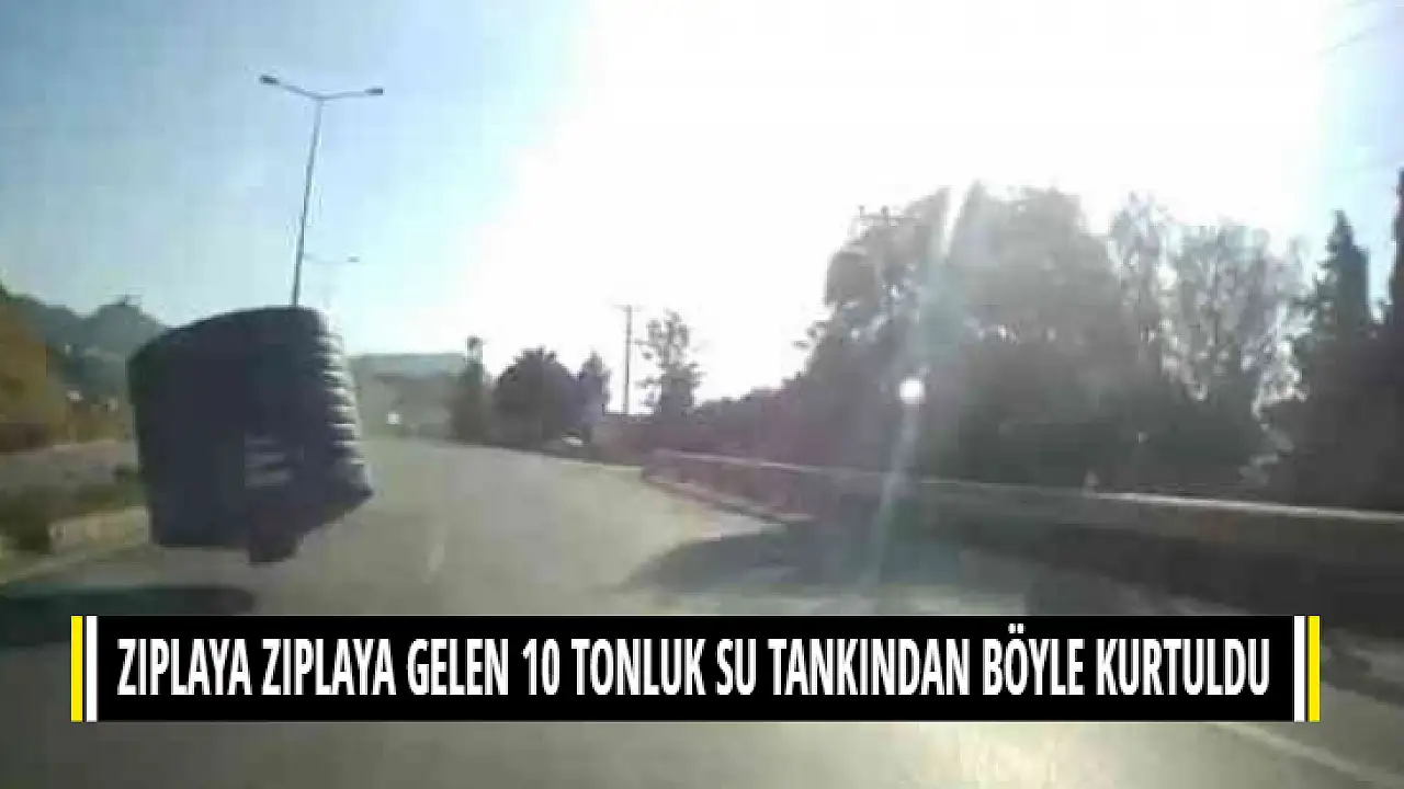 Muğla'nın Bodrum ilçesinden kamyonetin arkasında bulunan 10 tonluk su tankı virajda düşerek karşı şeritte geçti. Seyir halinde olan otomobilin üzerine zıplaya zıplaya gelen su tankını gören araç sürücüsü son anda yaptığı manevrayla ölümden döndü. O anlar araç kamerasına yansıdı.